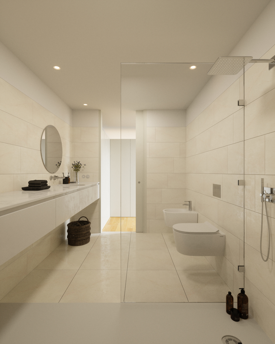 Casas de banho com loiças suspensas SANINDUSA, bases de duche walk-in, armários em MDF hidrófugo e espelhos anti-embaciamento